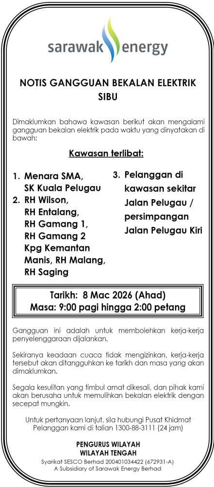 IKLAN Sabtu, 7-8 Mac 2026, SEB Notis Gangguan Bekalan Elektrik Sibu Utusan Sarawak 5 hours ago Continue Reading Previous: Sabtu, 7-8 Mac 2026, SEB Notis Gangguan Bekalan Elektrik Sarikei