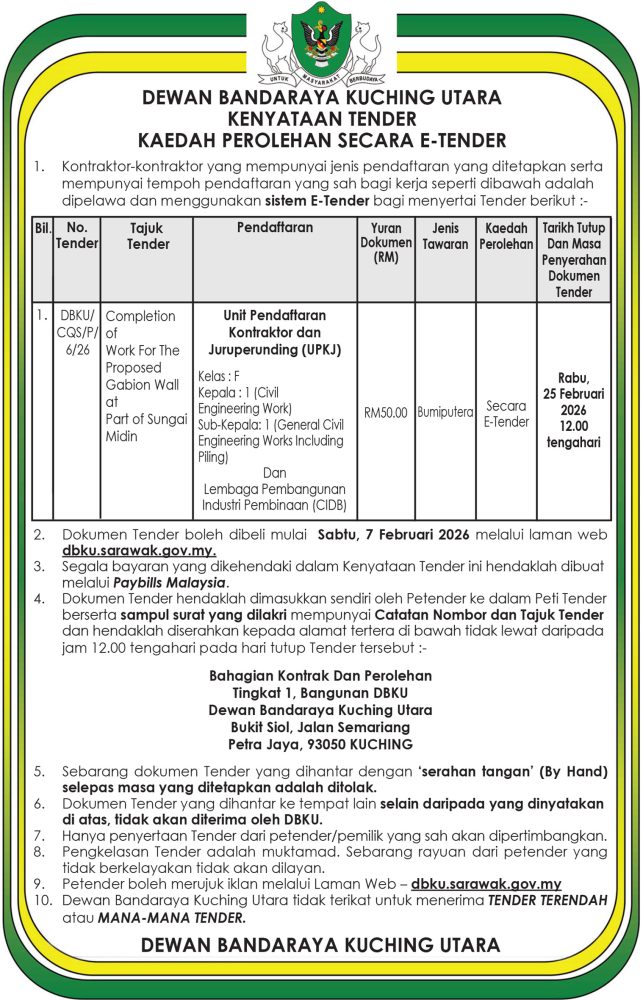 IKLAN Sabtu, 7 Februari 2026, DBKU_ CQS_P_ 6_26, Kenyataan Tender, Kaedah Perolehan Secara E-Tender Utusan Sarawak 6 hours ago Continue Reading Previous: Jumaat, 6-7 Februari 2026, SEB Notis Gangguan Bekalan Elektrik SarikeiNext: Sabtu, 7 Februari 2026, DBKU_CQS_S_1_26, Kenyataan Tawaran Tender Pelupusan Aset Alih