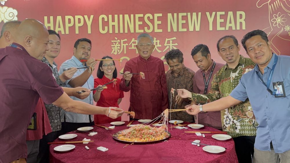 CLARENCE Ting (berdiri tengah) menggaul yee sang sebagai simbolik perasmian Majlis Sambutan Tahun Baharu Cina 2026 sempena Kempen Tahun Melawat Malaysia 2026 di Lapangan Terbang Sibu.