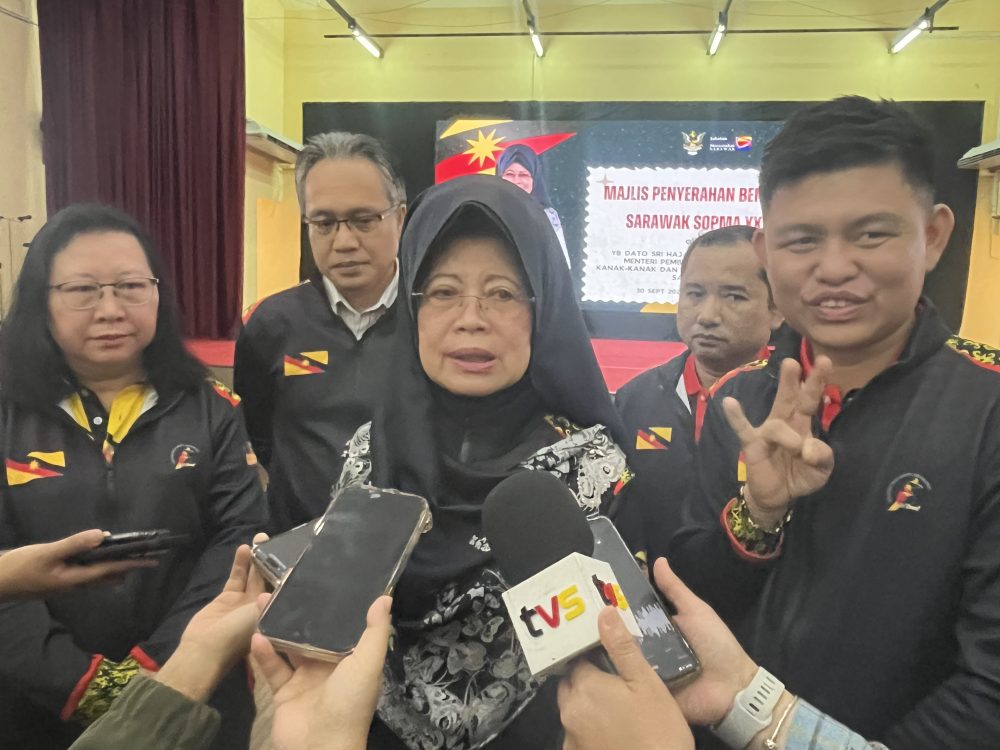 DATO Sri Fatimah Abdullah bercakap kepada media pada majlis Penyerahan Bendera Kontinjen Sarawak di Wisma Wanita, hari ini.
