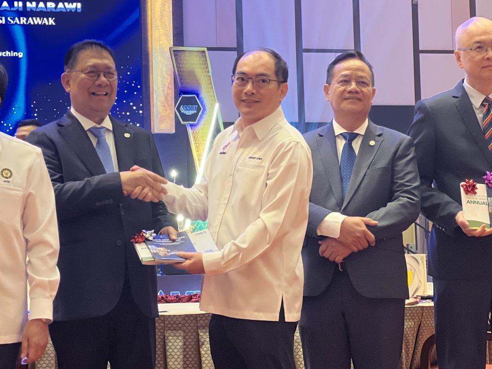 MENTERI Utiliti dan Telekomunikasi, Dato Sri Julaihi Narawi (kiri), menyerahkan Pelan Tahunan 2026 kepada wakil agensi sebagai simbolik pelaksanaan projek utiliti dan telekomunikasi untuk rakyat, di sebuah hotel terkemuka, Kuching, hari ini. Foto Adele Rissa