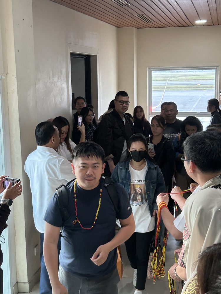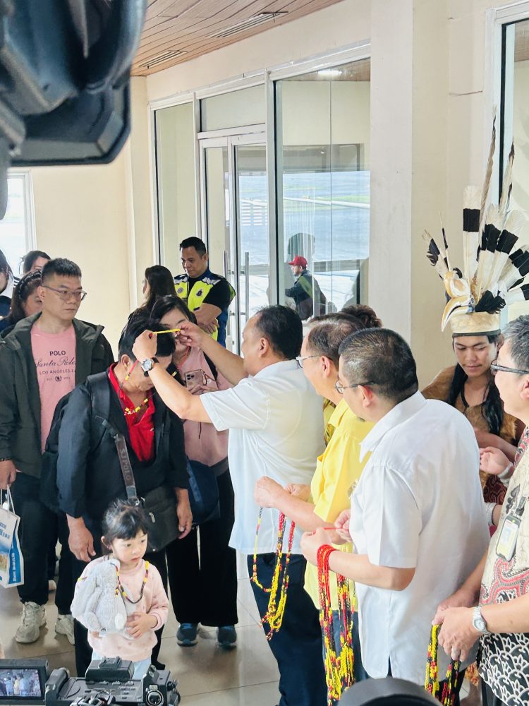 SELAMAT DATANG…Datuk Henry Harry Jinep bersama tetamu kehormat yang lain menyambut para penumpang dari Guangzhou ke Kuching pagi tadi. Foto Norman B