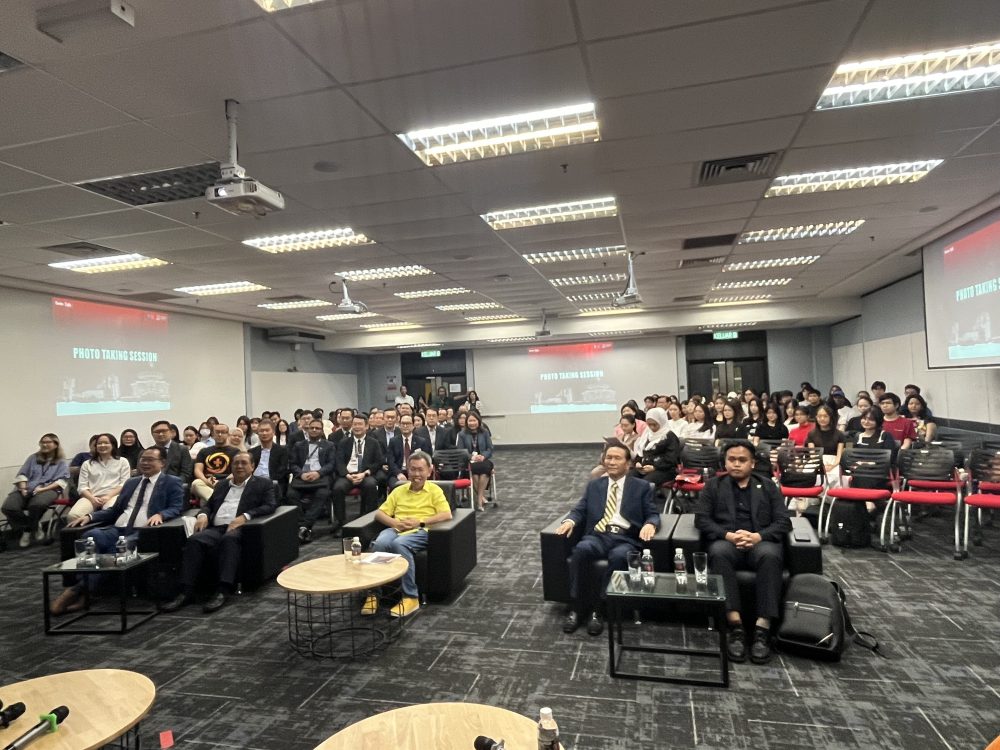 Timbalan Premier Sarawak, Datuk Amar Dr. Sim Kui Hian bergambar bersama peserta Program Swinburne’s SwinTalk di Universiti Teknologi Swinburne Sarawak, hari ini.