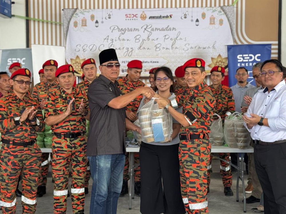KUCHING: SEDC Energy bersama Jabatan Bomba dan Penyelamat Malaysia (JBPM) Sarawak meneruskan tradisi tahunan Ramadan dengan mengagihkan bubur pedas kepada komuniti sekitar di PETROS Multifuel Station (MFS) Batu Kawa, di sini hari ini.