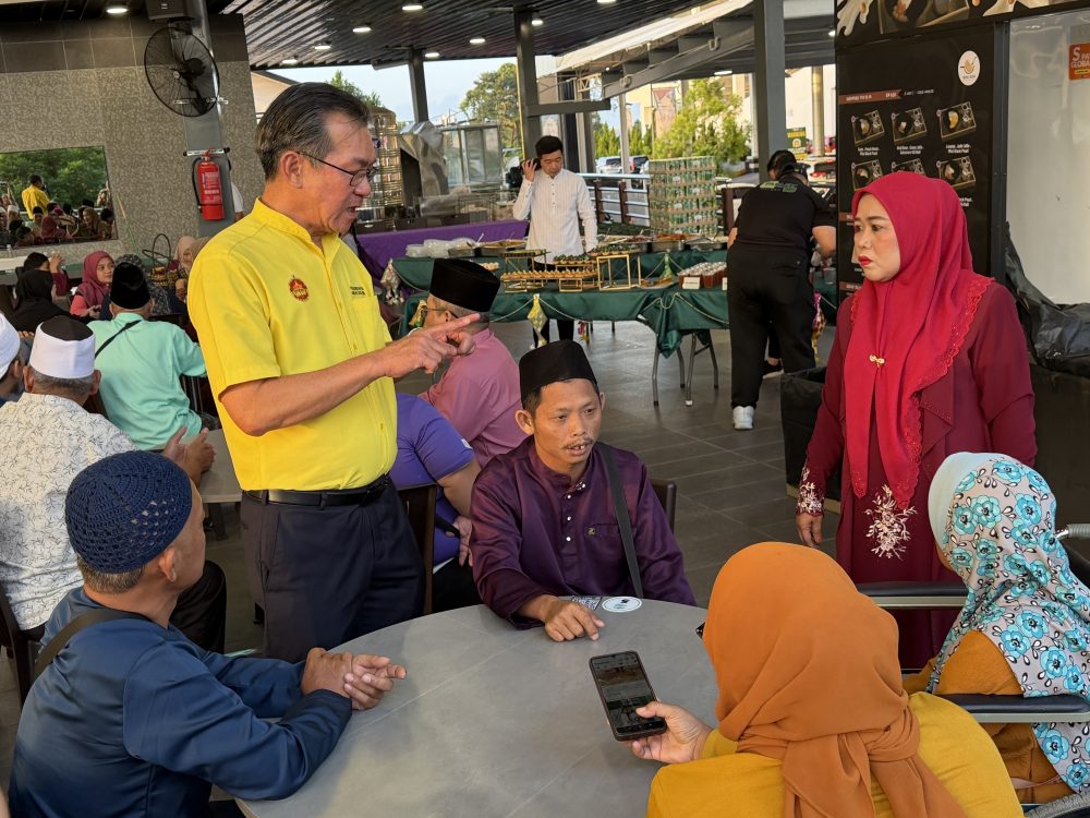 WILFRED Yap Yau Sin menyantuni tetamu yang hadir pada Program Pengagihan Bakul Makanan ‘Sejambak Kasih YB’ sempena Ramadan, di Farley Kuching, hari ini.