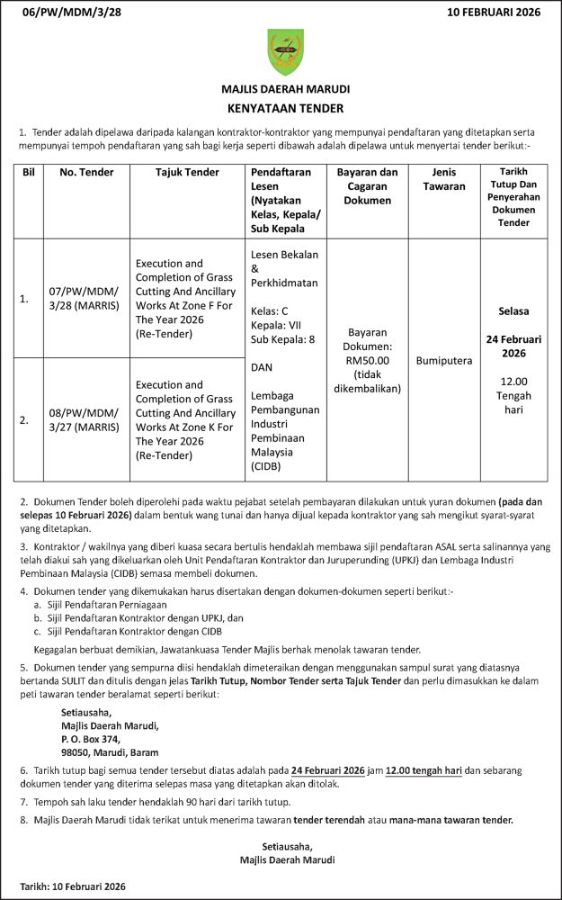 IKLAN Selasa, 10 Februari 2026, Majlis Daerah Marudi, Kenyataan Tender Utusan Sarawak 7 hours ago Continue Reading Previous: Ahad, 8-9 Februari 2026, SEB Notis Gangguan Bekalan Elektrik SibuNext: Selasa, 10 Februari 2026, Majlis Daerah Marudi, Sebut Harga