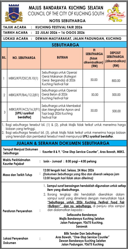 IKLAN Selasa, 10 Mac 2026, Majlis Bandaraya Kuching Selatan, Council Of The City Of Kuching South, Notis Sebutharga Utusan Sarawak 8 hours ago Continue Reading Previous: Selasa, 10 Mac 2026, Lembaga Boya Dan Api Sarawak, Jabatan Laut Malaysia Wilayah Sarawak, Notis Sebut Harga (Bekalan/Perkhidmatan)