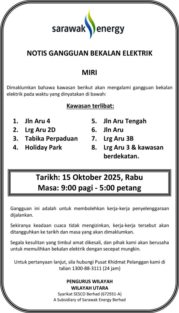 IKLAN Selasa, 14-15 Oktober 2025, SEB Notis Gangguan Bekalan Elektrik Miri-Jln Aru Utusan Sarawak 10 hours ago