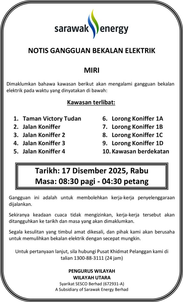 IKLAN Selasa, 16-17 Disember 2025, SEB Notis Gangguan Bekalan Elektrik Miri (Jln Koniffer) Utusan Sarawak 15 hours ago Continue Reading Next: Selasa, 16 Disember 2025, Majlis Daerah Limbang, RETENDER, Kenyataan Tender (Daerah Limbang Sahaja)
