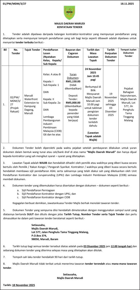 IKLAN Selasa, 18 November 2025, Majlis Daerah Marudi, Kenyataan Tender Utusan Sarawak 10 hours ago Continue Reading Previous: Isnin, 17-18 November 2025, SEB Notis Gangguan Bekalan Elektrik Miri (Krokop)Next: Selasa, 18-19 November 2025, SEB Notis Gangguan Bekalan Elektrik Kuching