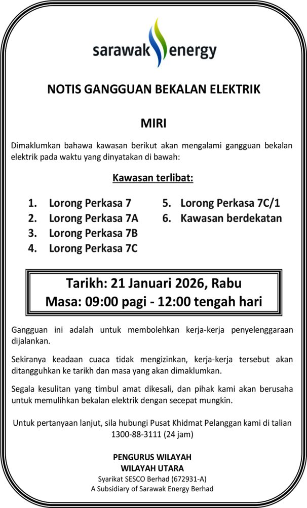 IKLAN Selasa, 20-21 Januari 2026, SEB Notis Gangguan Bekalan Elektrik Miri (Desa Senadin) Utusan Sarawak 8 hours ago Continue Reading Previous: Isnin, 19-21 Januari 2026, Pengurusan Harta Pelita Sdn. Bhd. Notice Of TenderNext: Selasa, 20-21 Januari 2026, SEB Notis Ganguan Bekalan Elektrik Kuching