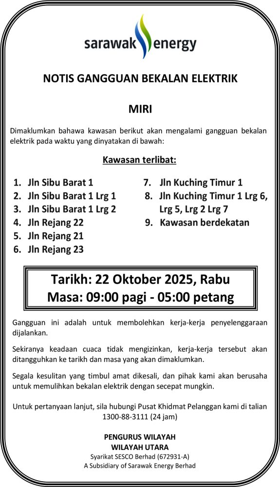 IKLAN Selasa, 21-22 Oktober 2025, SEB Notis Gangguan Bekalan Elektrik Miri (Taman Tunku) Utusan Sarawak 15 hours ago