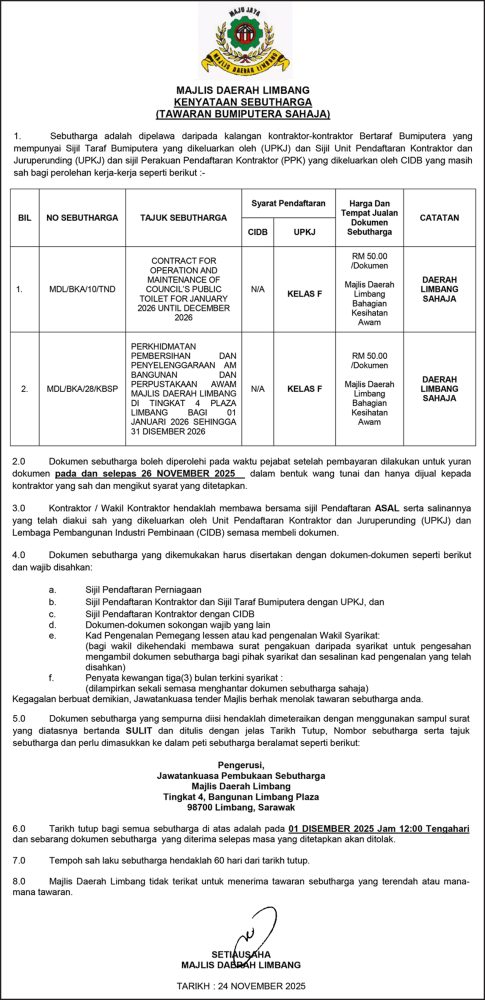 IKLAN Selasa, 25 November 2025, Majlis Daerah Limbang, Kenyataan Sebutharga Utusan Sarawak 3 hours ago Continue Reading Next: Selasa, 25 November 2025, SEB Notis Gangguan Bekalan Elektrik Miri (Jln Bunga Kertas)