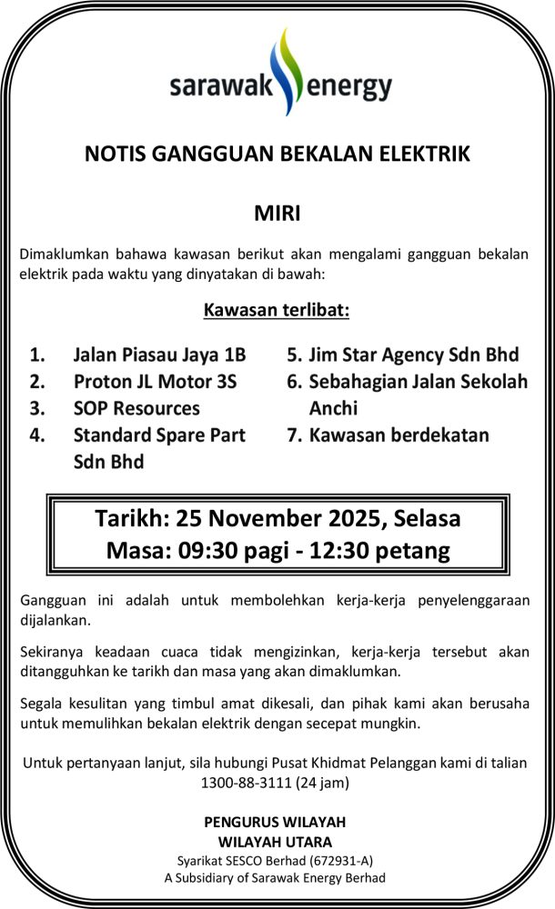 IKLAN Selasa, 25 November 2025, SEB Notis Gangguan Bekalan Elektrik Miri (Jln Sekolah Anchi) Utusan Sarawak 2 hours ago Continue Reading Previous: Selasa, 25 November 2025, SEB Notis Gangguan Bekalan Elektrik Miri (Jln Bunga Kertas)