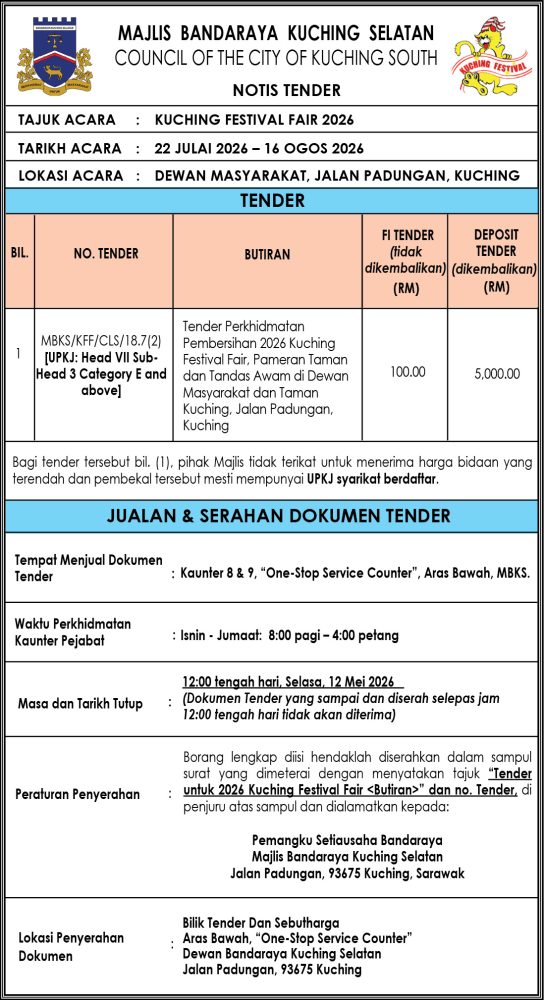 IKLAN Selasa, 28 April 2026, MBKS, Notis Tender Kuching Festival Fair 2026 Utusan Sarawak 6 hours ago Continue Reading Previous: Kami mencari wartawan untuk Daerah Kuching dan Mukah. Apakah anda berminat?Next: Selasa, 28-29 April 2026, SEB Notis Gangguan Bekalan Elektrik Kuching