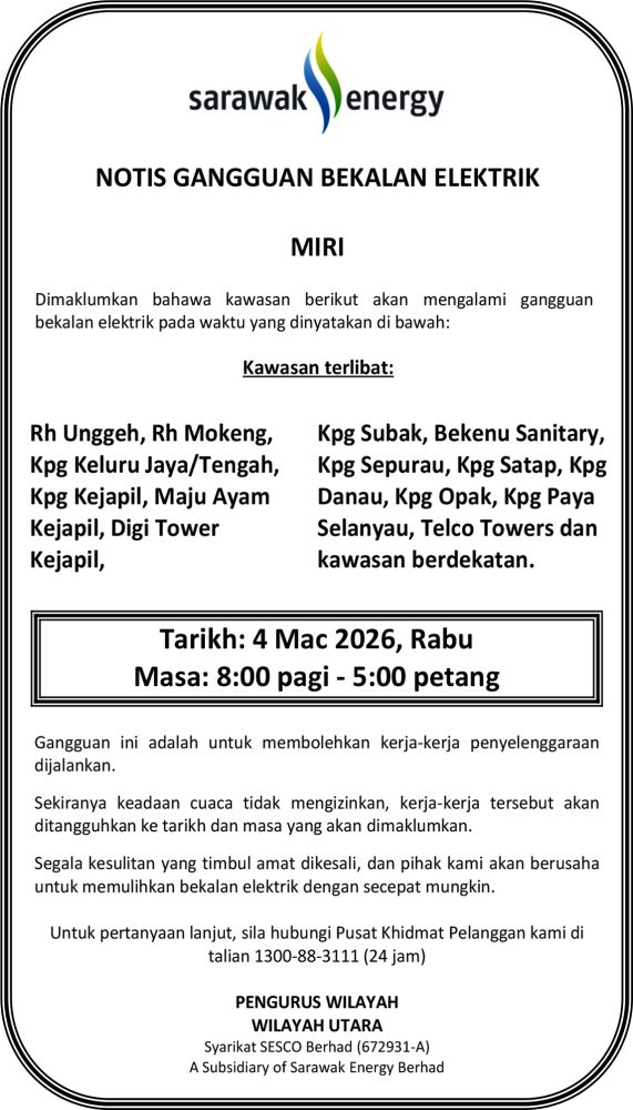 IKLAN Selasa, 3-4 Mac 2026, SEB Notis Gangguan Bekalan Elektrik Miri (Bekenu) Utusan Sarawak 6 hours ago Continue Reading Previous: Selasa, 3 Mac 2026, Majlis Daerah Limbang, Requotation, Kenyataan Sebutharga