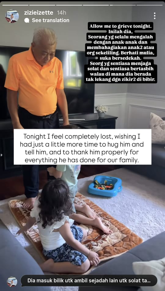 “Malam ini, saya berasa benar-benar hilang arah. Saya hanya berharap masih ada sedikit masa untuk memeluknya, menyampaikan segala yang ingin saya katakan, dan mengucapkan terima kasih dengan sepenuh hati atas segala jasanya kepada keluarga kami,” luah Zizie dalam hantaran Instagram Story (IGs) malam tadi.Dalam hantaran sama, Zizie memohon diberikan ruang untuk meratapi pemergian suaminya, yang disifatkannya sebagai seorang bapa yang sangat baik dan insan yang pemurah.