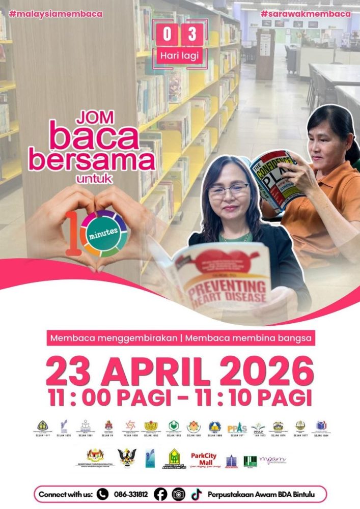 BINTULU: Orang ramai digesa untuk menyertai Program Jom Baca Bersama 10 Minit 2026 yang akan berlangsung pada Khamis ini (23 April), dari 11.00 pagi hingga 11.10 pagi.