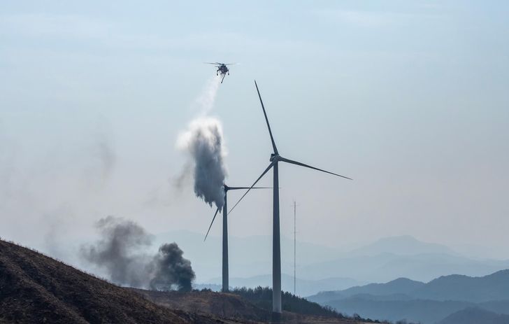Kebakaran itu tercetus sekitar 1:11 tengah hari di turbin dalam kompleks tenaga angin di daerah berkenaan, kira-kira 240 kilometer di tenggara Seoul, menurut pihak bomba tempatan.