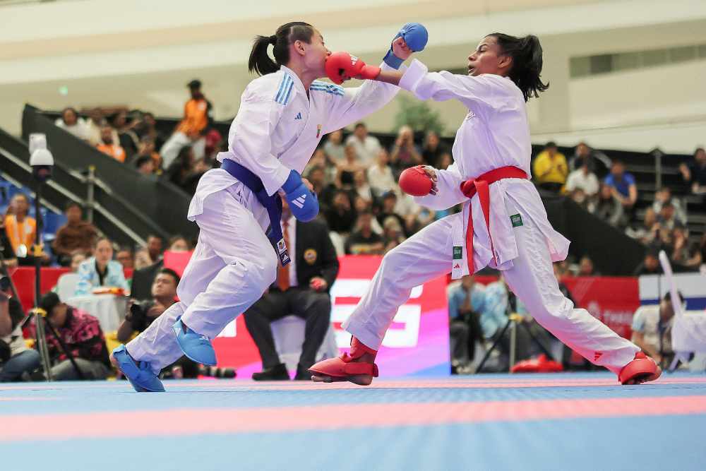 ATLET karate C. Shahmalarani (kanan) bersaing menentang Florence Nay Chi Htun dari Myanmar (kiri) dalam acara Kumite Wanita 50kg pada Sukan SEA ke-33 di Thailand, yang diadakan di Government Complex Chaeng Watthana hari ini. Foto BERNAMA