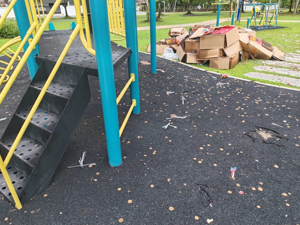 Taman BDC yang baharu dinaik taraf dan siap sepenuhnya lewat tahun lalu, didapati terdapat sisa seperti kotak kadbod, sarung plastik, bahan kimia yang tidak terbakar serta batang roket bertaburan di atas tanah.