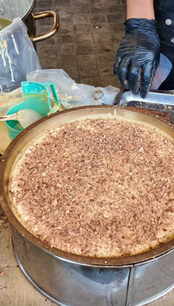 TABURAN kacang melimpah di atas apam balik yang sedang masak, menambah keenakan.