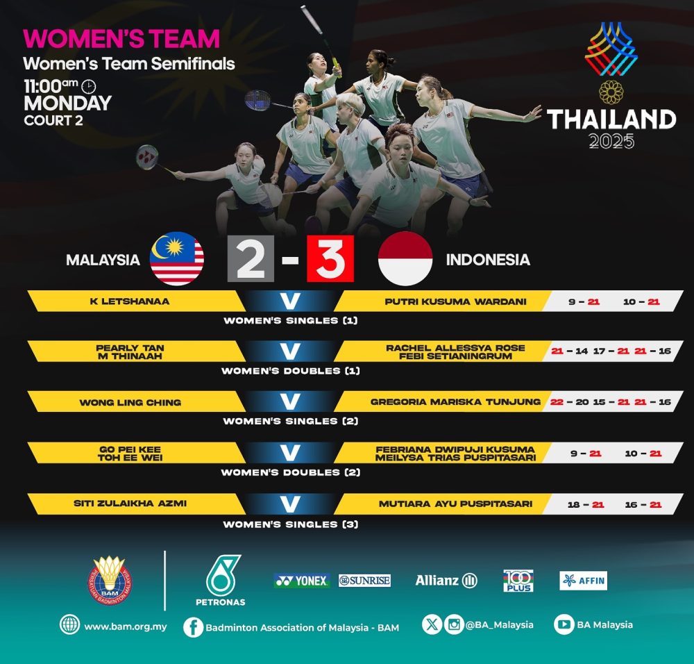 BANGKOK: Malaysia hampir menamatkan penantian lapan tahun untuk mara ke akhir badminton berpasukan wanita sebelum tewas 2-3 kepada Indonesia pada aksi separuh akhir Sukan SEA 2025 di Pathum Thani, Thailand hari ini.