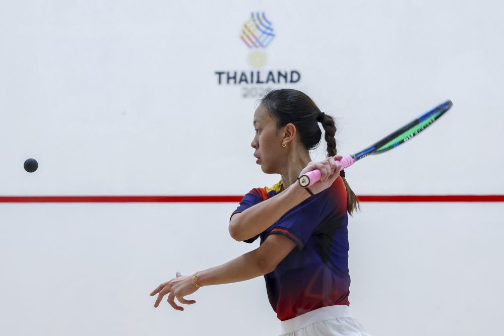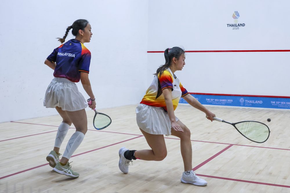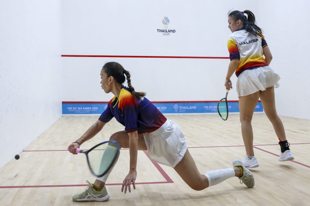 ATLET skuasy negara, Noor Ainaa Amani Ampandi ketika beraksi menentang rakan sepasukan, Yee Xin Ying dalam acara perseorangan lelaki pada perlawanan akhir skuasy perseorangan wanita Sukan SEA Thailand 2025 di Kolej Vajiravudh disini har? ini. Noor Ainaa Amani berjaya merangkul pingat emas selepas menang 11-7, 12-10, 8-11, 11-4. Foto BERNAMA