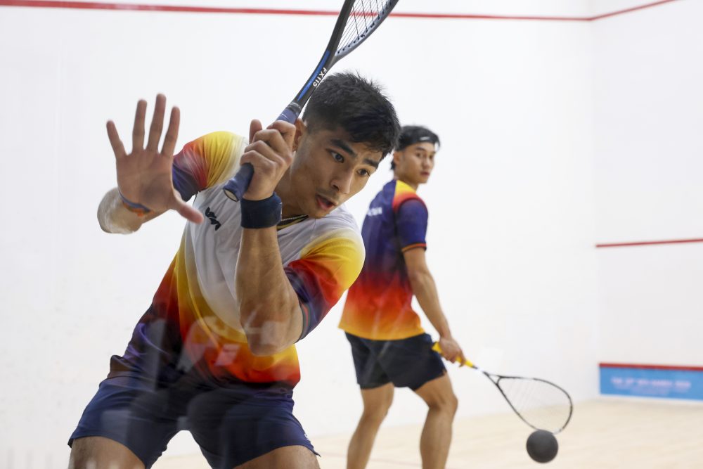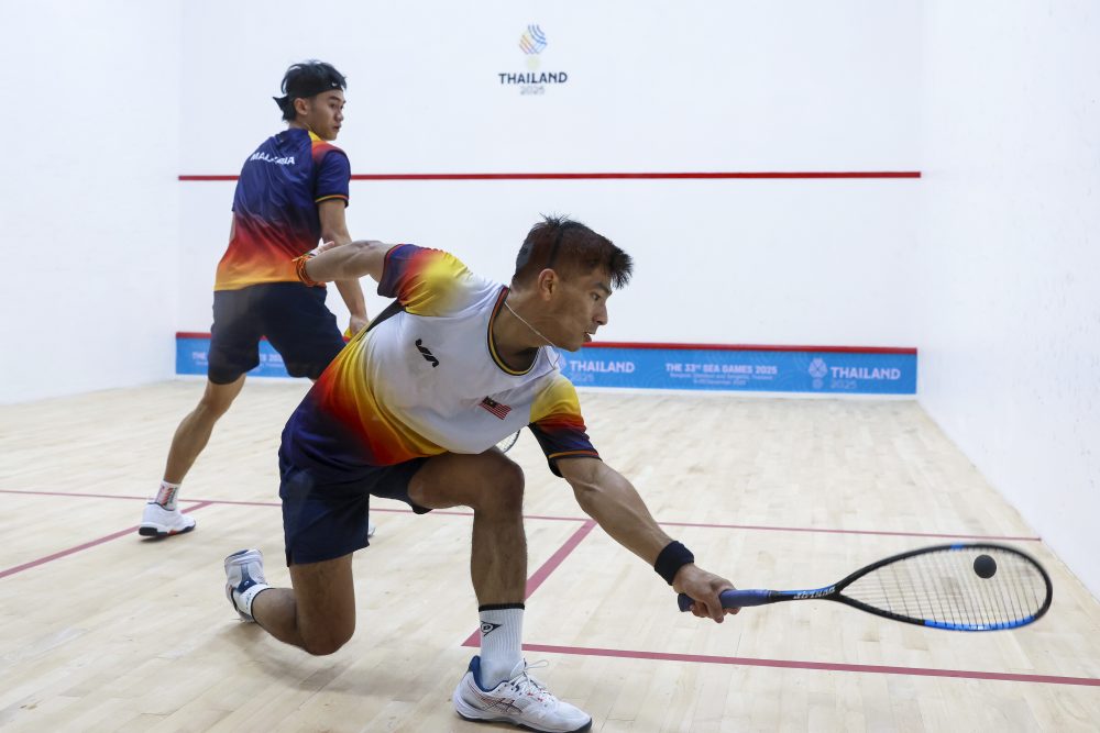 ATLET skuasy negara, Sanjay Jeeva (kiri) beraksi menentang rakan sepasukan, Duncan Lee Yung Yii dalam acara perseorangan lelaki pada perlawanan akhir skuasy perseorangan lelaki Sukan SEA Thailand 2025 di Kolej Vajiravudh disini har? ini. Sanjay Jeeva berjaya merangkul pingat emas selepas menang 6-11, 11-, 11-5, 11-4. Foto BERNAMA