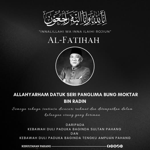 KUANTAN: Sultan Pahang, Al-Sultan Abdullah Ri’ayatuddin Al-Mustafa Billah Shah dan Tengku Ampuan Pahang, Tunku Azizah Aminah Maimunah Iskandariah menzahirkan ucapan takziah kepada keluarga Allahyarham Datuk Seri Bung Moktar Radin yang meninggal dunia, awal pagi tadi.