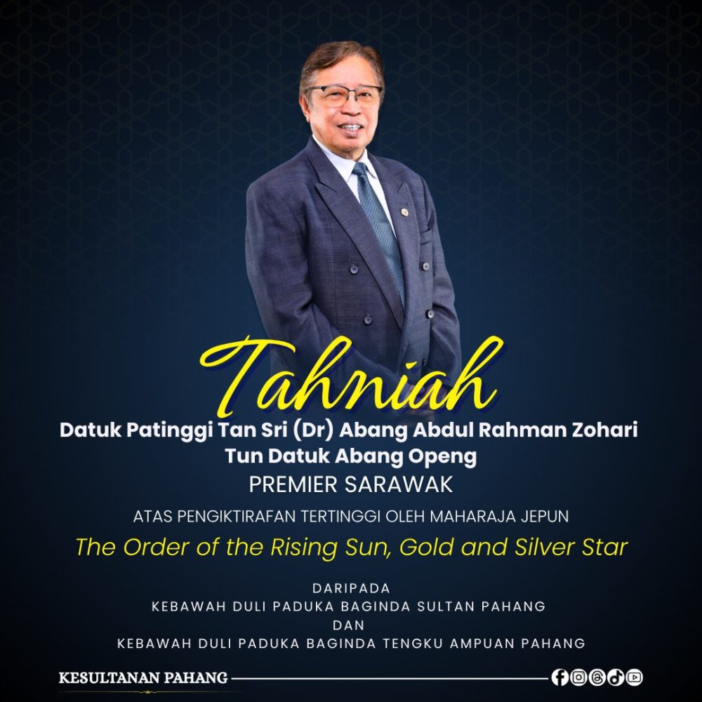 KUANTAN: Sultan Pahang Al-Sultan Abdullah Ri’ayatuddin Al-Mustafa Billah Shah menzahirkan ucapan tahniah kepada Premier Sarawak Datuk Patinggi Tan Sri Abang Johari Tun Openg atas penganugerahan The Order of the Rising Sun, Gold and Silver Star oleh Maharaja Jepun, Naruhito hari ini.