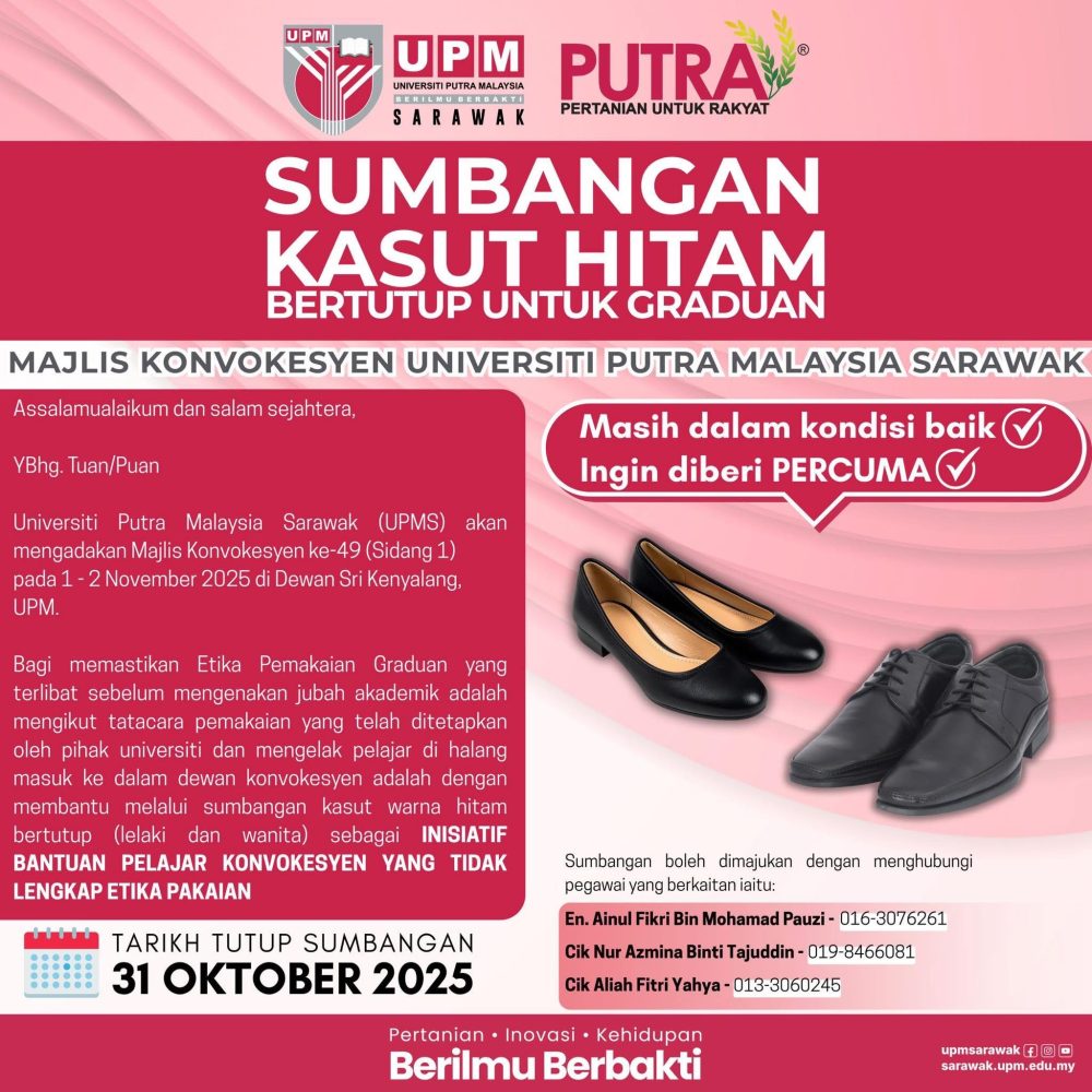 BINTULU: Universiti Putra Malaysia Kampus Sarawak (UPMS) menggesa orang awam serta warga universiti untuk bersama-sama menyumbang kasut hitam bertutup bagi membantu graduan yang bakal menghadiri Majlis Konvokesyen ke-49 (Sidang 1).