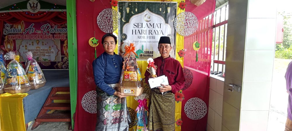 NAIB JOHAN…Pengerusi Surau Ar-Rahman Kamis Siman menyampaikan hadiah kepada Sherimem dalam pertandingan Lampu Raya 2026 Kampung Padang Kerbau Marudi. Foto : Jiku Juguong