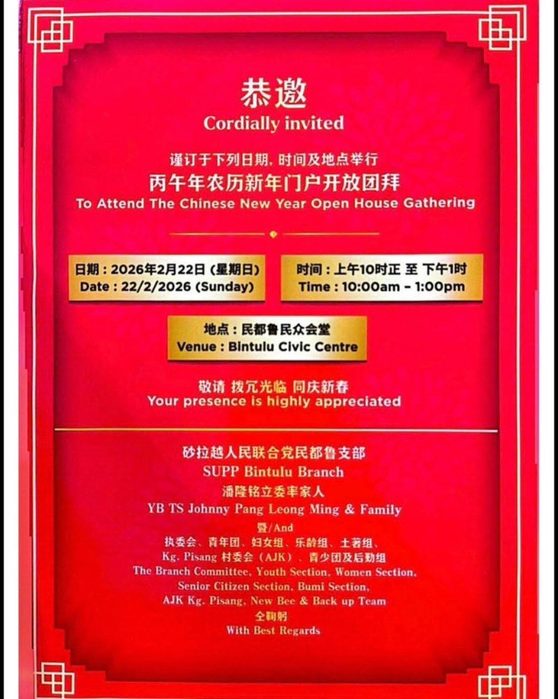 MAJLIS Rumah Terbuka Tahun Baharu Cina 2026 akan berlangsung pada 22 Februari ini dari 10.00 pagi hingga 1.00 tengah hari di Dewan Suarah Bintulu.