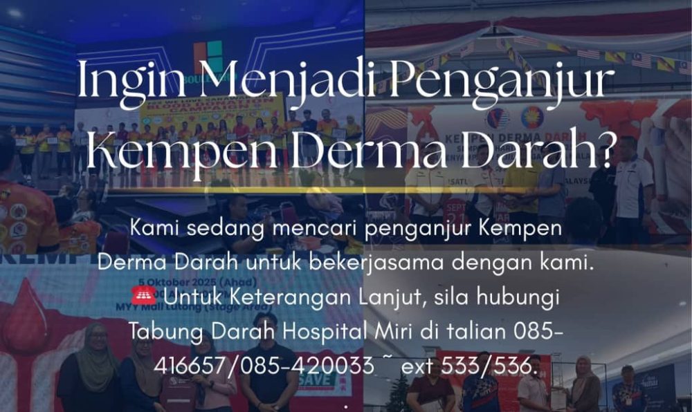 MIRI: Tabung Darah Hospital Miri menjemput pelbagai pihak termasuk badan kerajaan, pertubuhan bukan kerajaan (NGO), syarikat swasta, pusat beli-belah serta organisasi lain untuk bekerjasama sebagai penganjur Kempen Derma Darah bagi memastikan bekalan darah hospital sentiasa mencukupi.