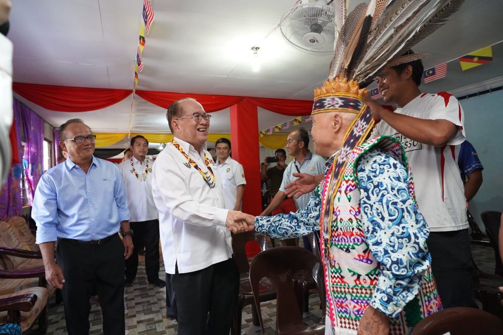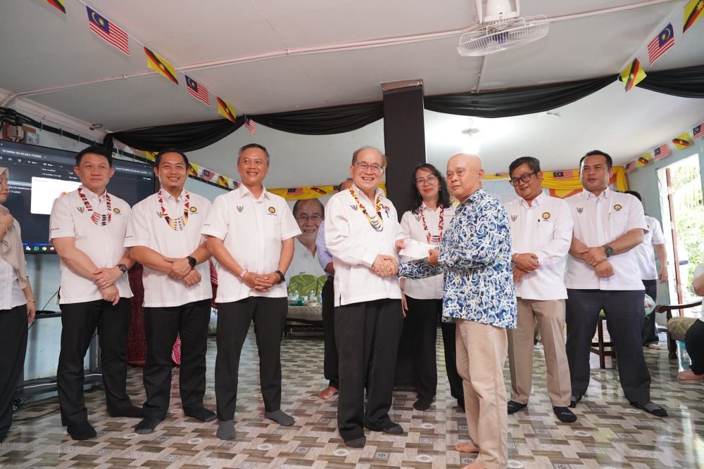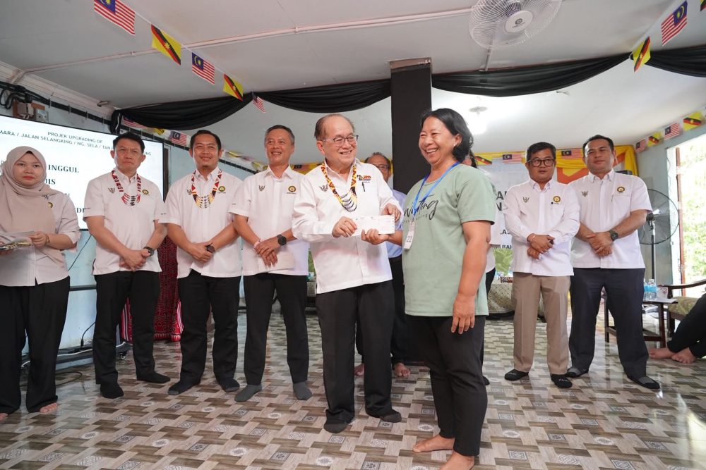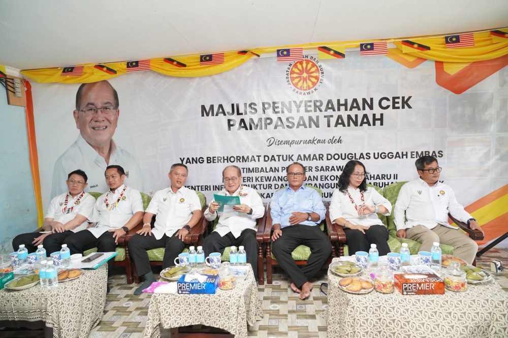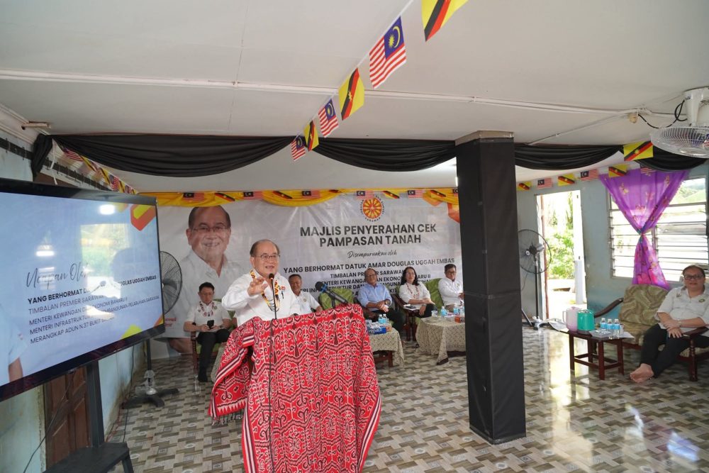 Datuk Amar Douglas Uggah Embas semasa hadir pada Majlis Penyerahan Cek Pampasan Tanah bagi projek cadangan menaik taraf Jalan Mara Selangking Nanga Sela Tanjung Paoh di sini, semalam. Foto: Pejabat Timbalan Premier