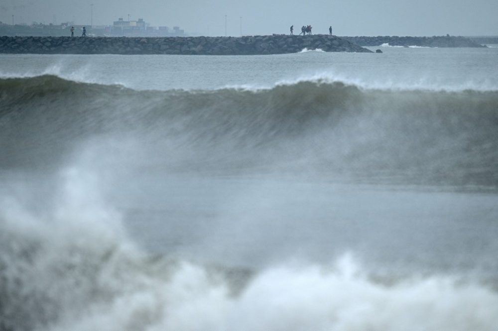 GELOMBANG pasang melanda ketika orang ramai berjalan berhampiran pantai di tengah hujan sebelum pendaratan Taufan Montha, di Chennai pada 28 Oktober 2025. Foto AFP