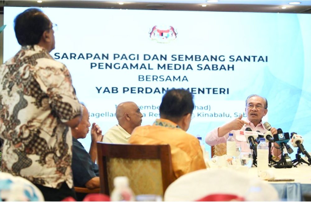 PERDANA Menteri, Datuk Seri Anwar Ibrahim berbual bersama wakil media ketika majlis Sarapan Pagi dan Sembang Santai Pengamal Media Sabah Bersama Perdana Menteri di Kota Kinabalu Ahad lalu. Pada majlis itu, beliau menjelaskan keputusan untuk menambah jumlah kerusi Parlimen di Sabah dan Sarawak sudah menjadi satu dasar untuk dilaksana kerajaannya. Foto Bernama.