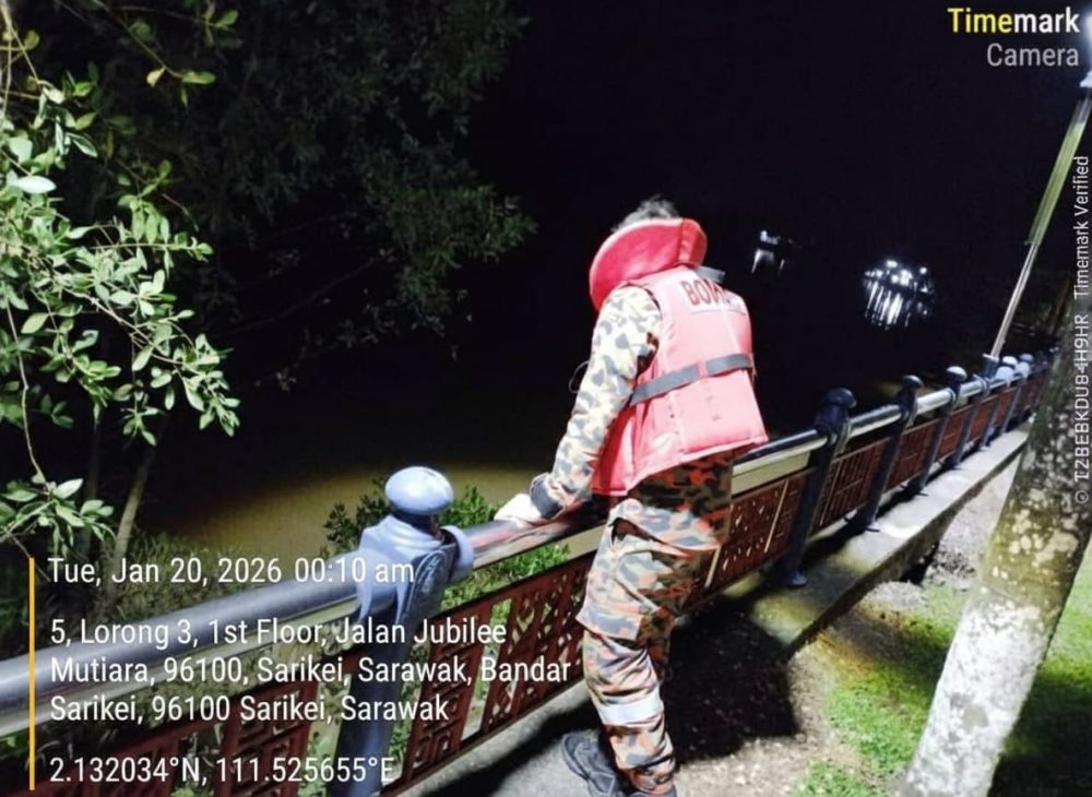 SARIKEI: Dua anggota bomba telah menjalankan rondaan pemantauan di kawasan Jalan Jubli Mutiara bagi menilai situasi paras air sepanjang tempoh monsun timur laut (MTL) pada tengah semalam.