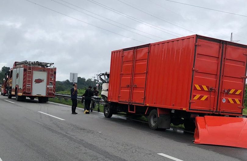 KEMALANGAN jalan raya melibatkan sebuah lori tiga tan dan sebuah lori lima tan di Lebuh Raya Pan Borneo berhampiran Sarawak Energy Sub Station Betong, pagi tadi. Foto: PGO Bomba Sarawak