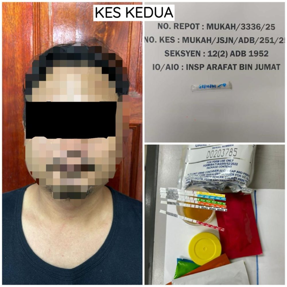 “Anggaran berat keseluruhan dadah yang dirampas adalah 1.14 gram dengan anggaran nilai RM200. Ujian urin yang dijalankan mendapati suspek positif dadah jenis amphetamine dan methamphetamine, kes disiasat di bawah Deksyen 12(2) Akta Dadah Berbahaya 1952 dan Seksyen 15(1)(a) ADB 1952.
