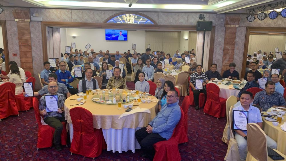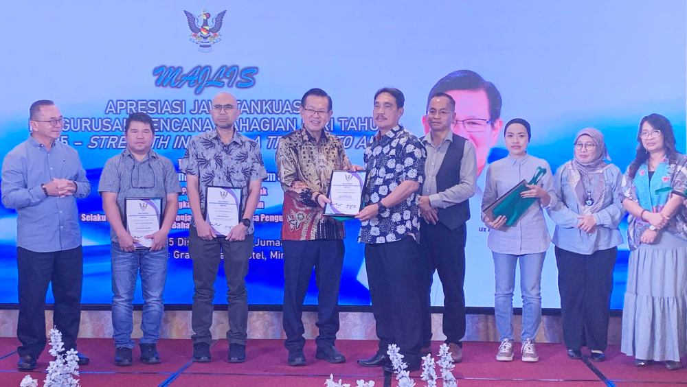 TERIMA KASIH… Dato Sri Lee Kim Shin (enam kanan) menyampaikan sijil penghargaan kepada wakil agensi yang terlibat pada majlis Apresiasi Jawatankuasa Pengurusan Bencana Bahagian (JPBB) Miri semalam.