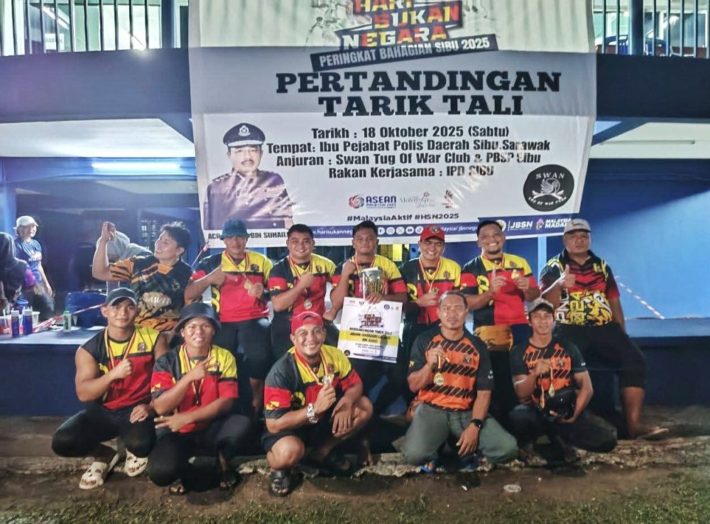SIBU: Pasukan Trassmerah dari Kabong muncul juara Pertandingan Tarik Tali bagi kategori Lelaki 720 kilogram (kg) sempena Hari Sukan Negara (HSN) 2025 Peringkat Bahagian Sibu yang berlangsung di Padang Bola Sepak Ibu Pejabat Polis Daerah (IPD) Sibu, semalam.