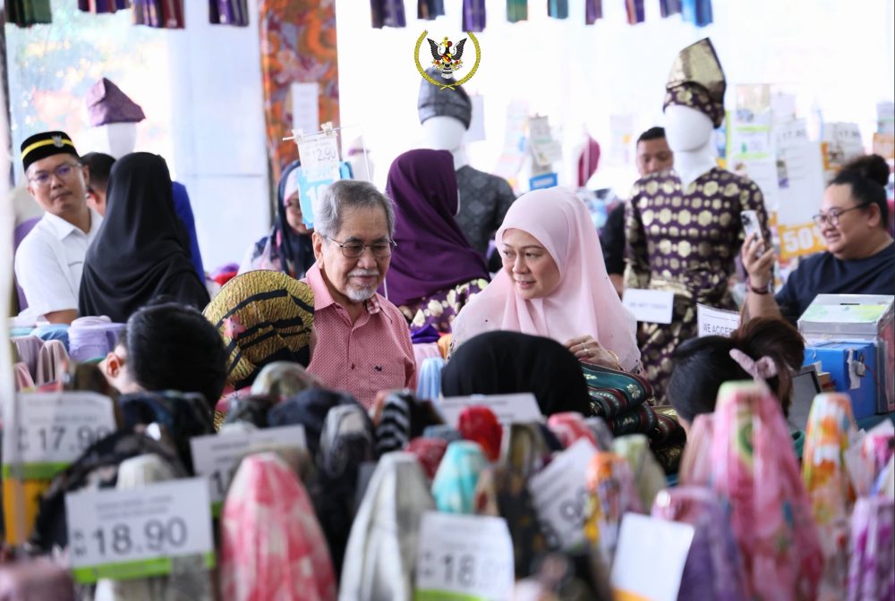 TUN Wan Junaidi dan Toh Puan Fauziah telah meluangkan masa berkunjung ke gedung tekstil Kamdar yang terletak di Jalan Stampin, Kuching, hari ini. Foto Astana Negeri Sarawak