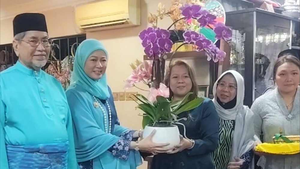 TERIMA KASIH…Toh Puan Fauziah Mohd Sanusi menerima cenderahati berupa bunga orkid yang disampaikan oleh ahli keluarga Rosey Yunus.