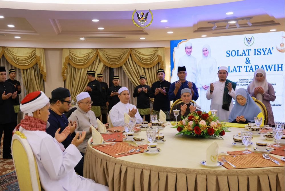 PETRA JAYA: Yang di-Pertua Negeri, Tun Pehin Sri Wan Junaidi Tuanku Jaafar bersama Toh Puan Datuk Patinggi Fauziah Mohd Sanusi, hadir menunaikan solat tarawih berjemaah bersama warga Pejabat Yang di-Pertua Negeri di Surau Astana Sarawak di sini semalam.