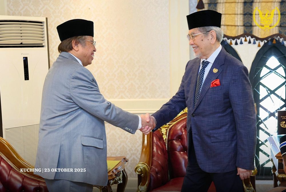 PETRA JAYA: Yang di-Pertua Negeri, Tun Pehin Sri Wan Junaidi Tuanku Jaafar, hari ini menerima kunjungan hormat daripada Premier Sarawak, Datuk Patinggi Tan Sri Abang Johari Tun Openg, di pejabat rasmi Yang di-Pertua Negeri.