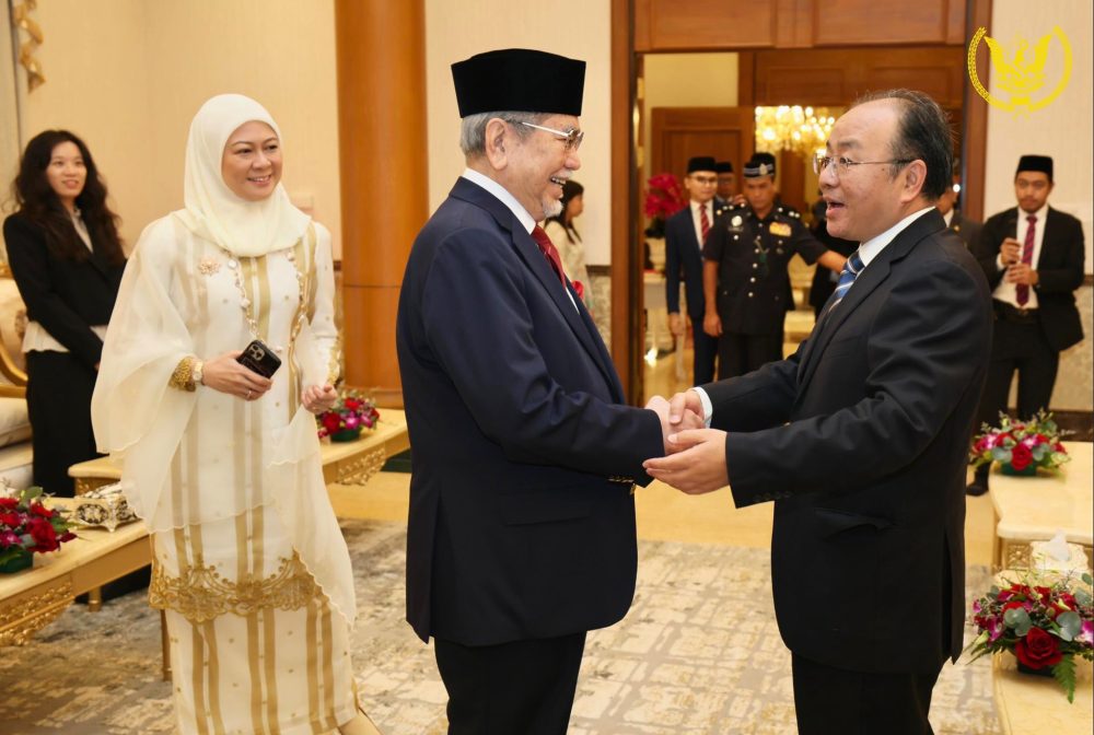 PETRA JAYA: Yang di-Pertua Negeri, Tun Pehin Sri Wan Junaidi Tuanku Jaafar bersama Toh Puan Datuk Patinggi Fauziah Mohd Sanusi telah menerima kunjungan hormat daripada Duta Besar Republik China ke Malaysia, Ouyang Yujing di kediaman rasmi beliau di sini, hari ini.