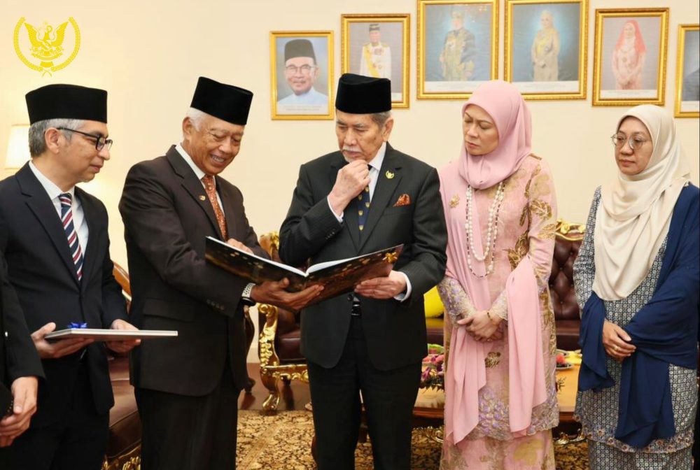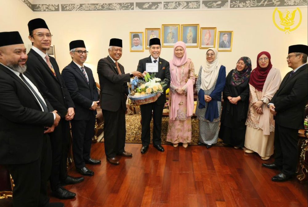 PETRA JAYA: Yang di-Pertua Negeri, Tun Pehin Sri Wan Junaidi Tuanku Jaafar bersama Toh Puan Datuk Patinggi Fauziah Mohd Sanusi hari ini telah menerima kunjungan hormat Ketua Hakim Syarie Jabatan Kehakiman Syariah Sarawak bersama delegasi di Astana Negeri.