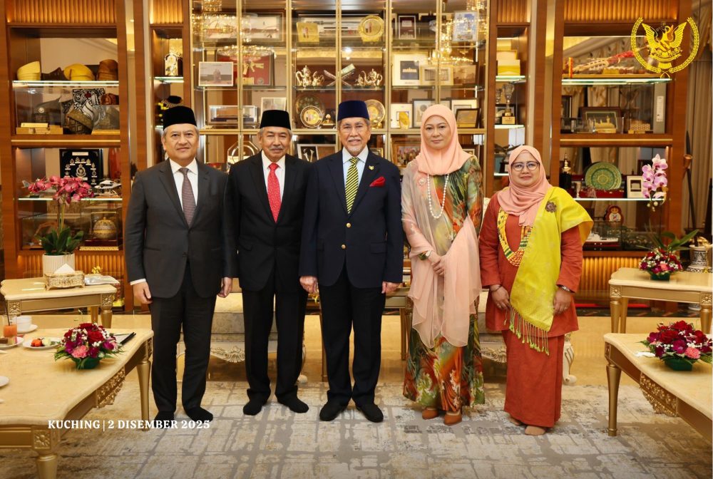PETRA JAYA: Yang di-Pertua Negeri, Tun Pehin Sri Wan Junaidi Tuanku Jaafar dan Toh Puan Datuk Patinggi Fauziah Mohd Sanusi hari ini telah menerima kunjungan hormat daripada delegasi Yayasan Hasanah Malaysia di kediaman rasmi, di sini.